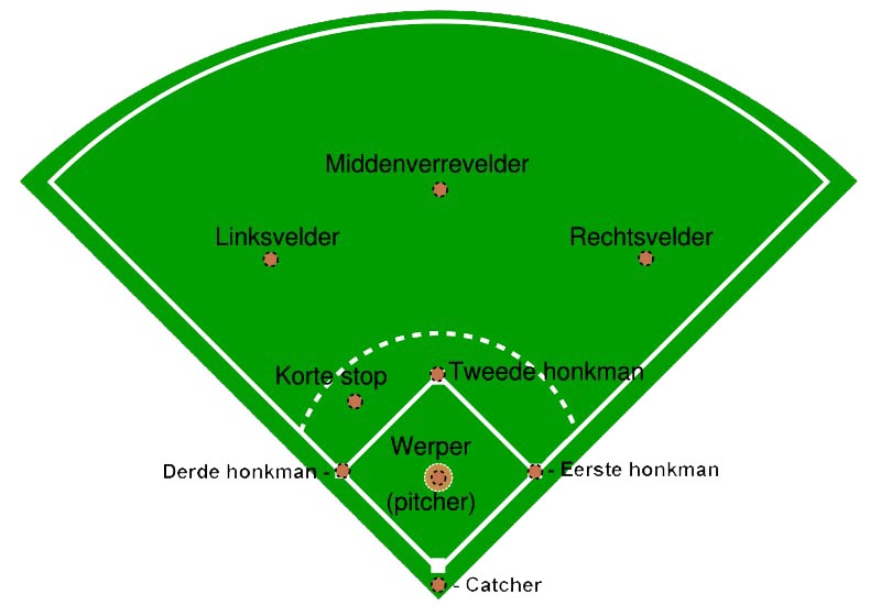 de posities van de veldspelers tijdens een honkbalwedstrijd weergegeven.